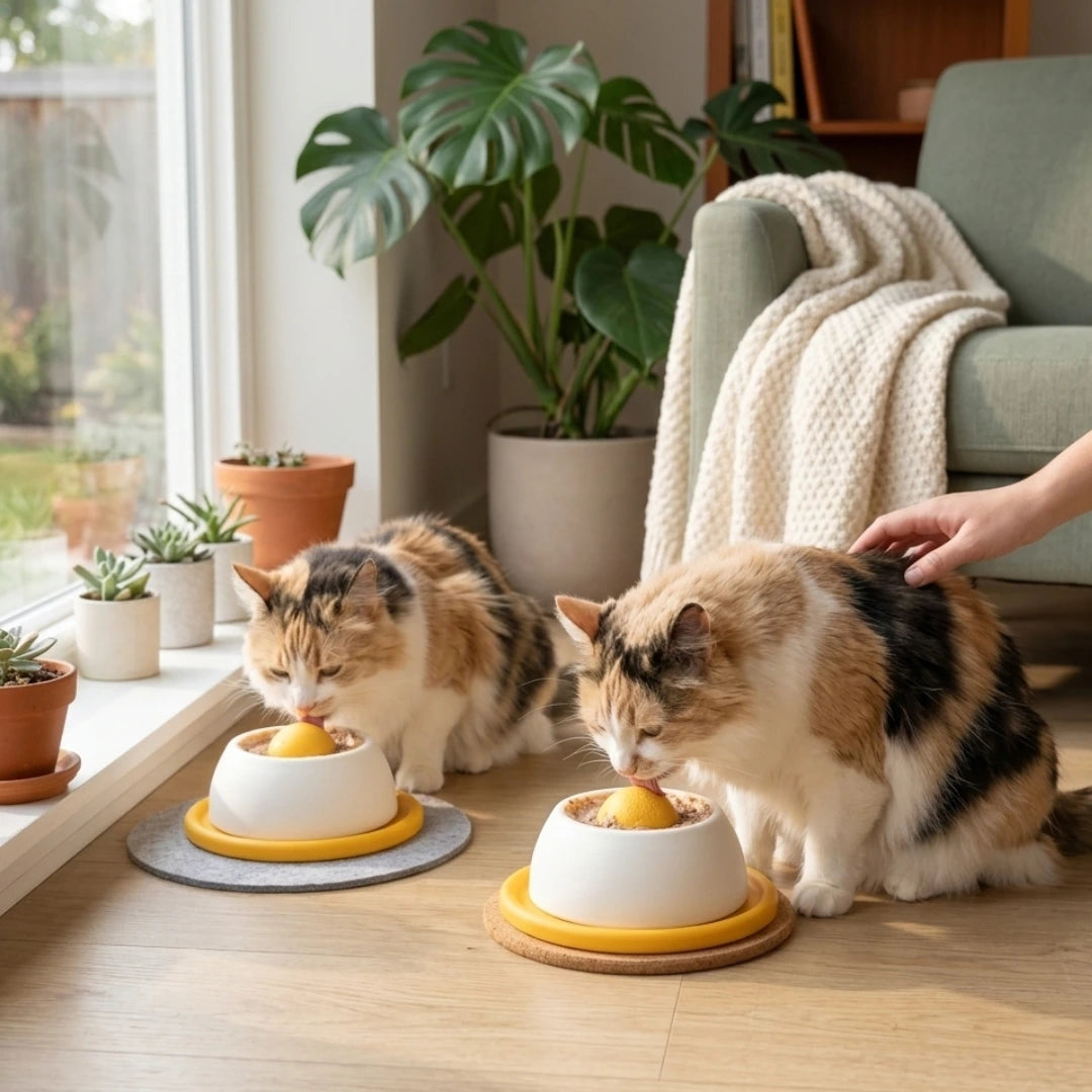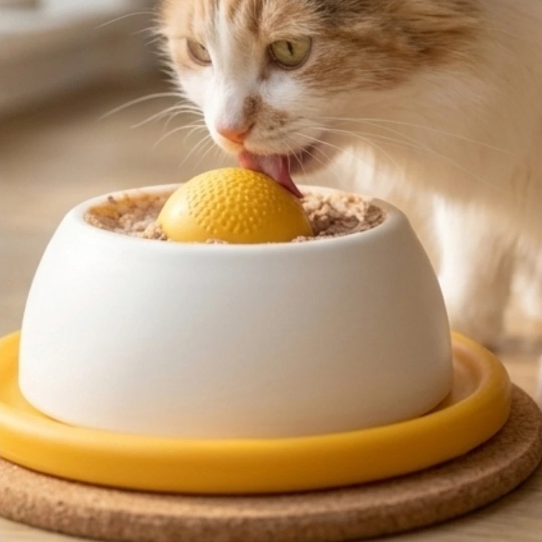 Voor vrijwel alle katten, van kitten tot senior. Jonge katten ontdekken het voedselpatroon snel; oudere katten waarderen het rustige tempo. Voor katten met een vlak gezicht — zoals Perzen of Brits Korthaar — werkt de ondiepe zone van de kom het best. Begin met een dun laagje natvoer en laat ze zelf ontdekken.